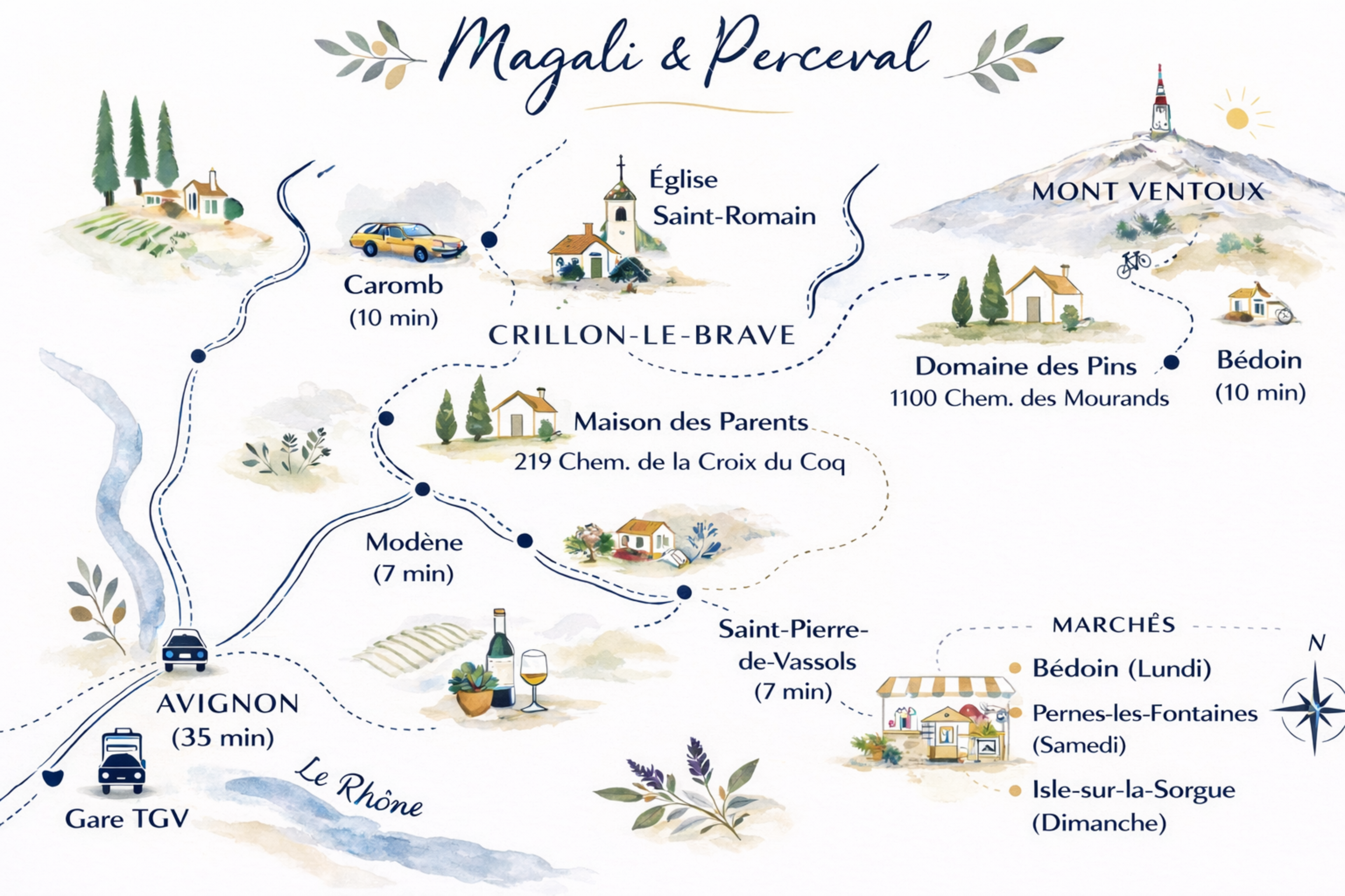 Pour celles et ceux qui seront déjà dans la région la veille du mariage (jeudi 10 septembre 2026), nous serions ravis de vous accueillir à partir de 16h chez les parents de Perceval dans le village de Crillon-le-Brave. L’occasion de se retrouver pour une après-midi au bord de la piscine agrémentée d’un petit pastis, de quelques parties de pétanque et de pizzas.